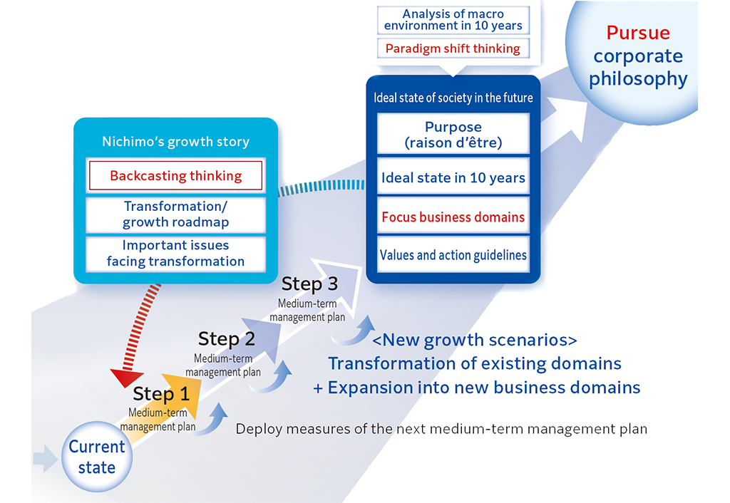 In formulating the new medium-term plan, in order to respond to the paradigm shift occurring in the marine products industry and future changes in the business environment that are difficult to predict, we have shifted our planning from a past-driven, cumulative approach to a backcasting approach.