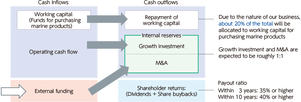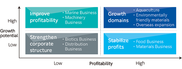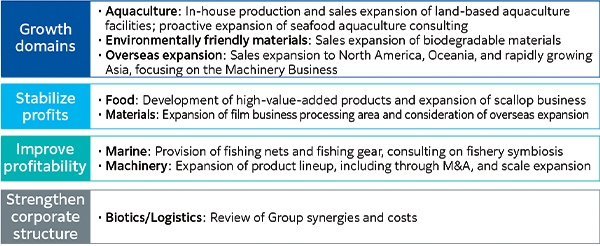 The basic concept of the Fiscal 2026 Medium-Term Management Plan (the “new medium-term plan”) is to “strengthen core businesses and stabilize earnings structure.” This represents our efforts to strengthen our core businesses by continuing to provide long-term support throughout the entire supply chain as a solutions partner for the fishing and marine products industries, and to stabilize our earnings structure by restructuring our business portfolio to achieve a better balance. We will also actively consider M&A as a way to achieve these aspirations.