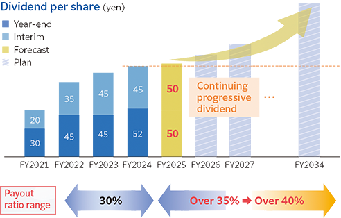 Looking at our medium- to long-term dividend policy for the next three and ten years, during the new medium-term plan, we will maintain our basic policy of stable dividends as before, while continuing our effective progressive dividend policy. Our intention is to raise the payout ratio to 35% or more by FY2027, three years from now. We will also consider rolling out shareholder benefits and share buybacks, which have been requested by many investors.