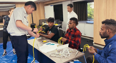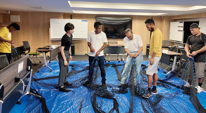 In Harumi, Chuo Ward, Tokyo, a training course for trainees from Micronesia and Papua New Guinea on the skills required to board purse seine nets in Japan (onboard safety management, rope work, net repair, etc.) is held, as a commissioned project of the Overseas Fishery Cooperation Foundation (OFCF). During the practical skills training, the Group employees have served as instructors, teaching practical skills necessary in the field for rope work and for tailoring and repairing purse seine nets.